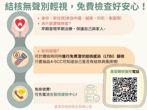 本市新住民潛伏結核感染(LTBI)治療及都治(DOPT)計畫,主要針對新住民(中國大陸(含港澳)、越南、印尼、泰國、菲律賓及柬埔寨新住民為主,因應換發證件需求而進行居留體檢之新住民優先)主動進行潛伏結核感染抽血檢驗,若檢驗結果為陽性,則在胸部X光排除活動性肺結核後,直接進行潛伏結核感染治療(LTBI),以利完善我國結核病防治成效,爰鼓勵新住民多加參與。